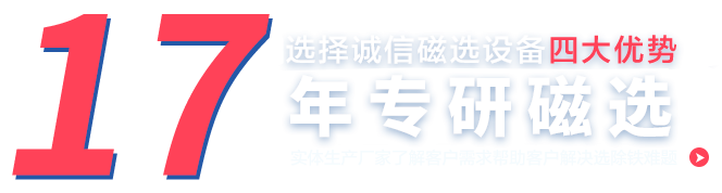 鞏義市誠信機械廠是河南省內多年生產磁選設備、永磁除鐵器和有色金屬分選設備的生產廠家,立足磁分選行業多年,致力于磁分選設備的研發和生產制造,公司主營產品有:磁選機、永磁筒式磁選機、濕式磁選機、干式磁選機、精選磁選機、小型磁選機、鈦鐵磁選機、鋼渣磁選機、石英砂磁選機、除鐵設備、永磁除鐵器、非金屬磁選機、金屬磁選機、選鐵設備、選錳設備、渦電流金屬分選機、鋁塑分選機、渦電流分選機生產線、不銹鋼分選機、鐵鋁不銹鋼分選生產線等,用于各種鐵礦粉的精選回收、選廠、鋼廠、電廠、水泥及爐渣、鋼渣、鐵渣和金屬與非金屬中磁性物質的篩選作業,我們磁分選技術成熟,工藝精湛,歡迎廣大客戶到廠區實地考察。